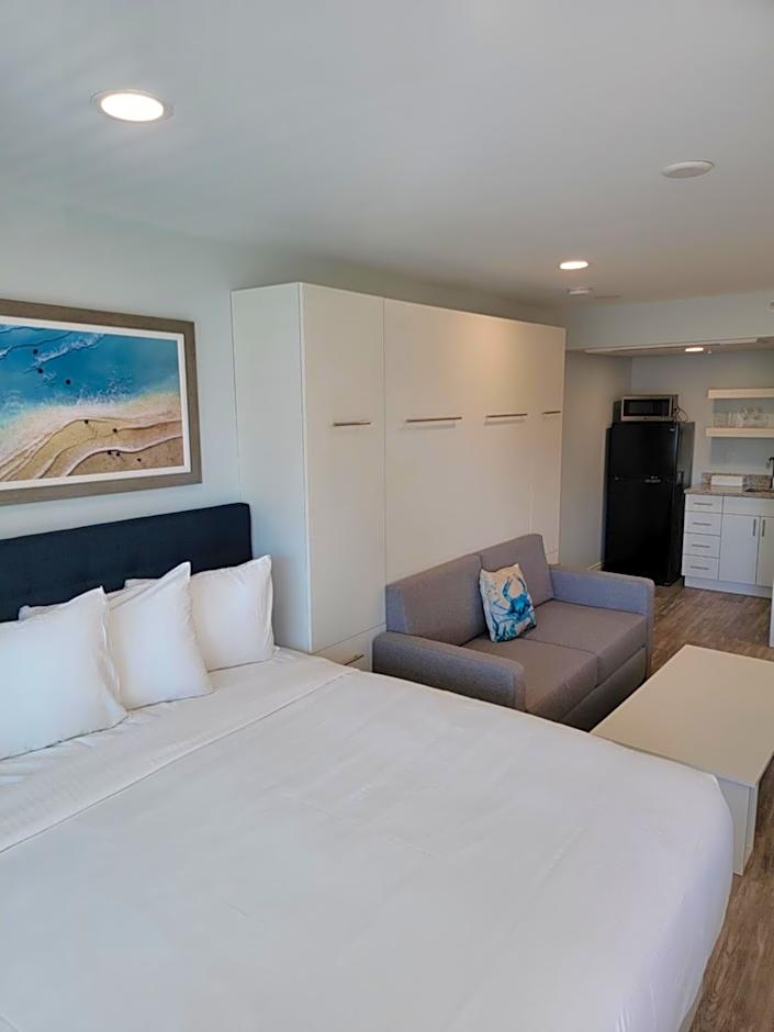 This studio features a microwave, small refrigerator, and seating area with a sofa bed.